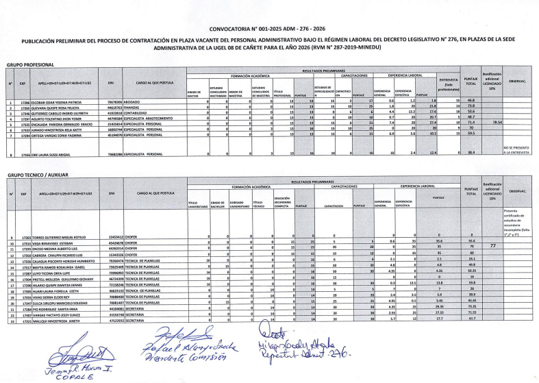 RESULTADOS PRELIMINARES DEL PROCESO DE CONTRATACION DEL D.L 276 PARA EL AÑO 2026