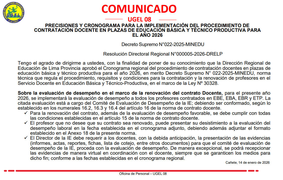 Jue, 15 de enero, 2026 San Vicente Cañete.PRECISIONES Y CRONOGRAMA PARA LA IMPLEMENTACIÓN DEL PROCEDIMIENTO DE CONTRATACIÓN DOCENTE EN PLAZAS DE EDUCACIÓN BÁSICA Y TÉCNICO PRODUCTIVA PARA EL AÑO 2026 Descargar comunicado: https://drive.google.com/file/d/1d_hvCDsrZ3ePNaVEWNwtgROlXfb74fst/view?usp=sharing