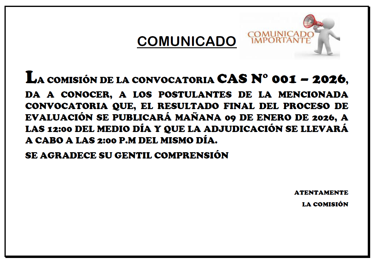 Vie, 9 de enero, 2026 San Vicente Cañete.Se hace de conocimiento público los RESULTADOS FINALES de la CONVOCATORIA CAS N° 01-2026 🗓️ ADJUDICACIÓN DE PLAZAS: Según lo dispuesto, el acto de adjudicación se realizará: 👉 Día: HOY (Viernes) ⏰ Hora: 2:00 PM (Hora exacta) 📥 DESCARGAR RESULTADOS AQUÍ: 🔗 https://drive.google.com/file/d/1WbkV78ri4DhTrIKm6VCGc73tpL6JkcO8/view?usp=sharing