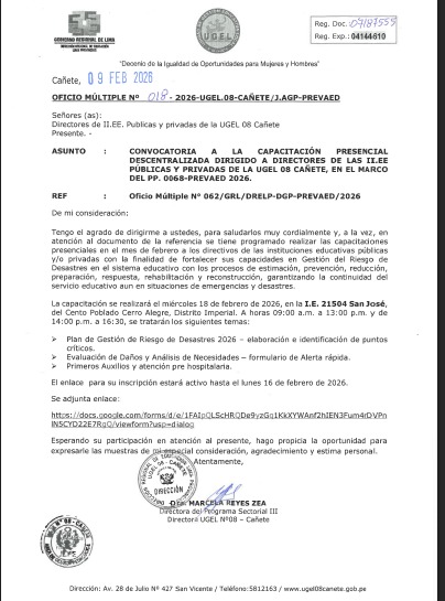 Vie, 6 de febrero, 2026 San Vicente Cañete.Se informa a los Directores y Docentes de las Instituciones Educativas de la UGEL 08 Cañete sobre las disposiciones para la presentación de Licencias por Incapacidad Temporal (Salud), según el Oficio Múltiple N° 016-2026. 📝 PLAZOS DE PRESENTACIÓN: La solicitud debe presentarse ante el jefe inmediato en un plazo máximo de:✅ 2 días hábiles contados […]