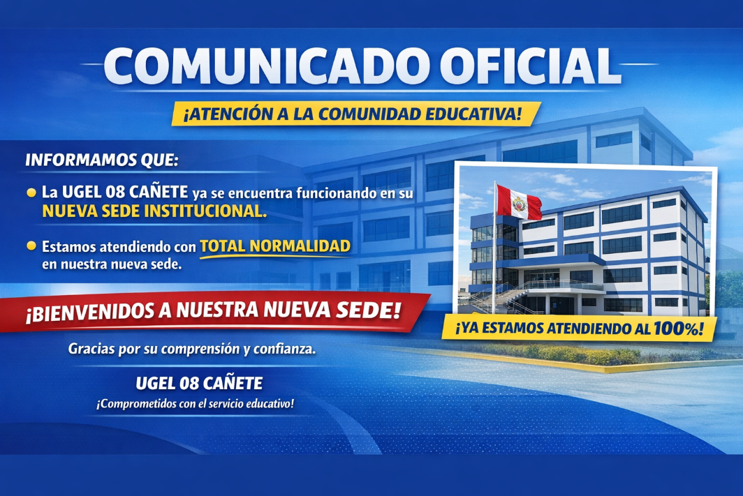 Vie, 20 de febrero, 2026 San Vicente Cañete.La Unidad de Gestión Educativa Local N.° 08 de Cañete informa a los directivos, docentes, personal administrativo, padres de familia y público en general lo siguiente: PRIMERO: Se comunica que el proceso de traslado institucional ha culminado satisfactoriamente. Toda la UGEL 08 CAÑETE ya se encuentra operando en su NUEVA SEDE INSTITUCIONAL, ubicada a espaldas […]