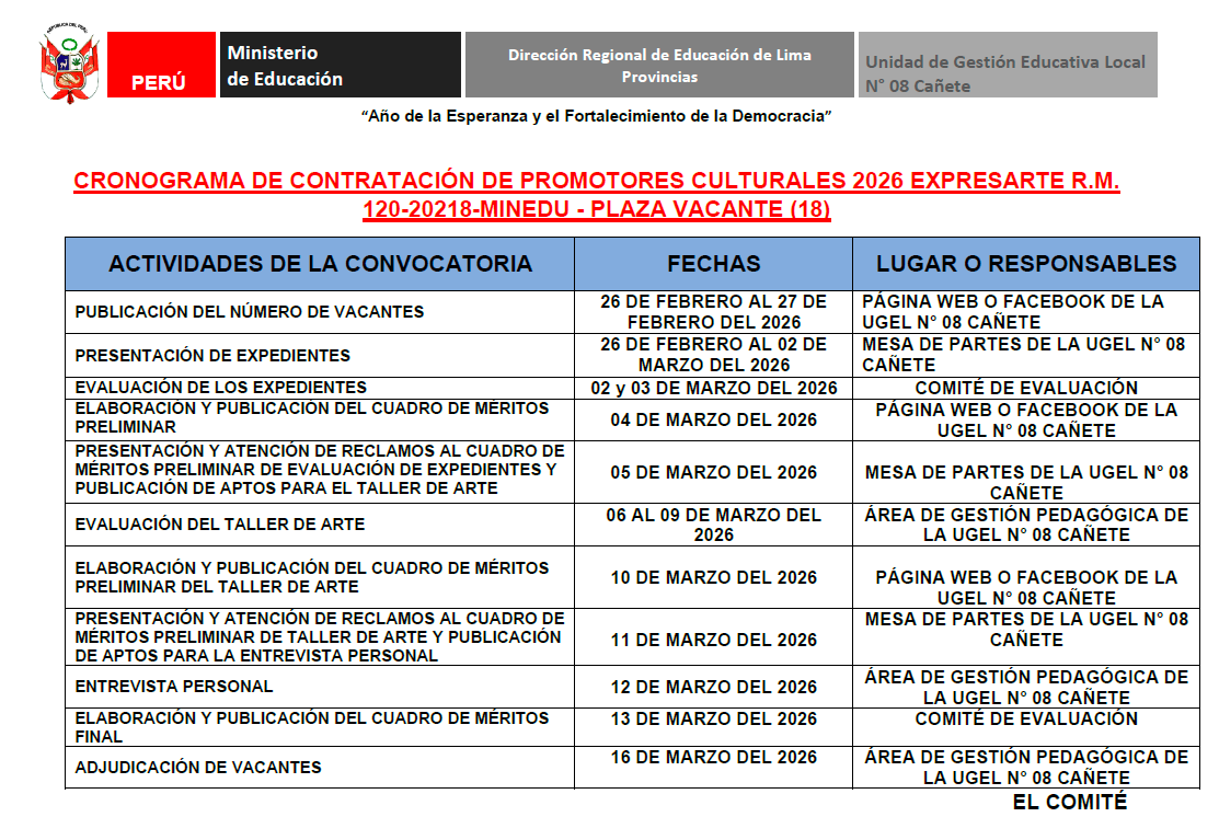 Leer mas...PROCESO DE CONTRATACIÓN EN PLAZA VACANTE DEL PERSONAL ADMINISTRATIVO BAJO EL RÉGIMEN LABORAL DEL DECRETO LEGISLATIVO N° 276, EN PLAZAS DE LA SEDE ADMINISTRATIVA DE LA UGEL 08 DE CAÑETE PARA EL AÑO 2026 (RVM N° 287-2019-MINEDU)