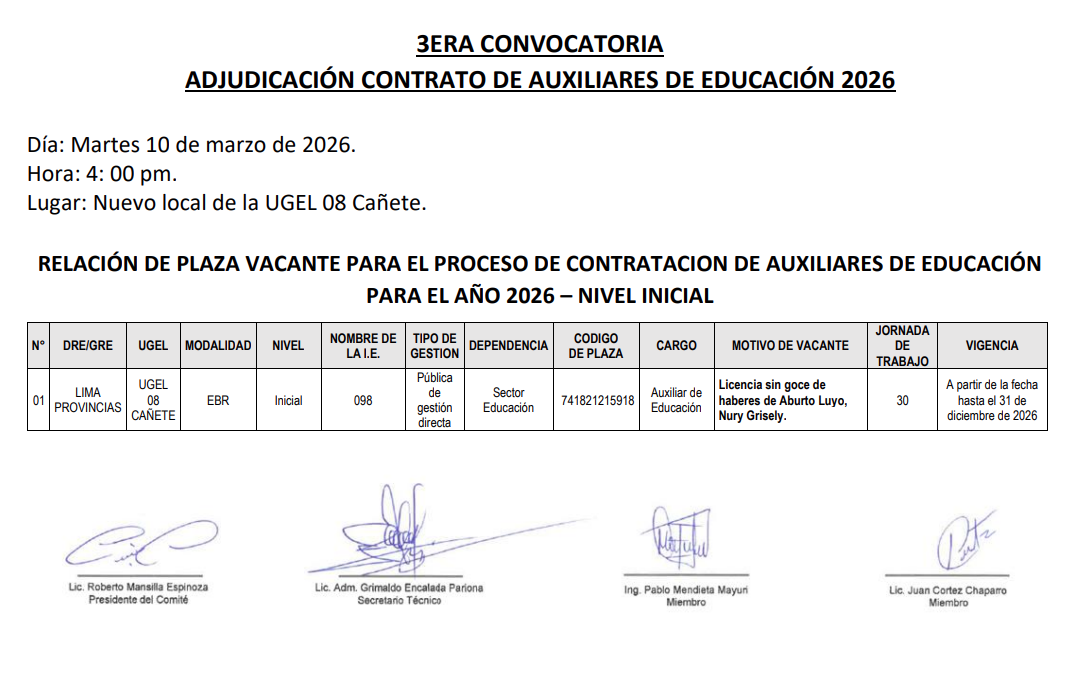 Lun, 9 de marzo, 2026 San Vicente Cañete.La UGEL 08 Cañete informa a los interesados sobre la 3ra Convocatoria para la Adjudicación de Contrato de Auxiliares de Educación 2026 – Nivel Inicial. 📅 Fecha: Martes 10 de marzo de 2026🕓 Hora: 4:00 p. m.📍 Lugar: Nuevo local de la UGEL 08 Cañete 🔎 En esta convocatoria se realizará la adjudicación de plaza […]