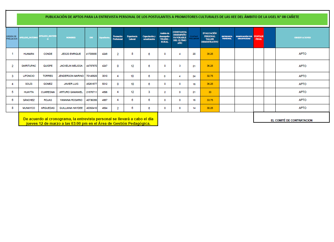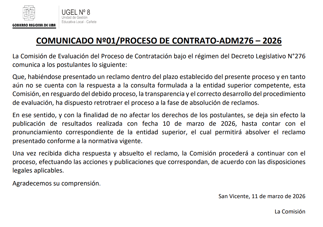 Mar, 10 de marzo, 2026 San Vicente Cañete.La UGEL N.° 08 Cañete comunica a los postulantes y al público en general los resultados preliminares de la evaluación curricular y del taller demostrativo del proceso de selección de Promotores Culturales de las II.EE. del ámbito de la UGEL N.° 08 Cañete. 📄 Los interesados pueden descargar y revisar el cuadro completo de resultados […]