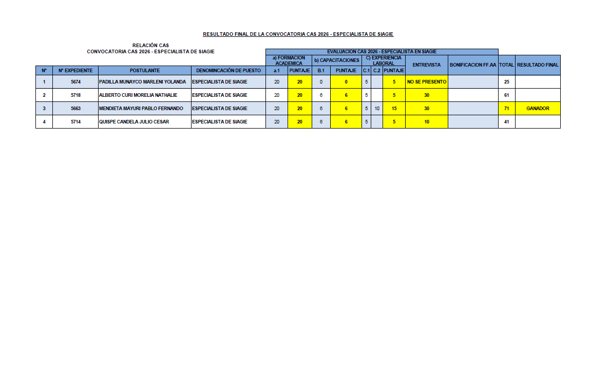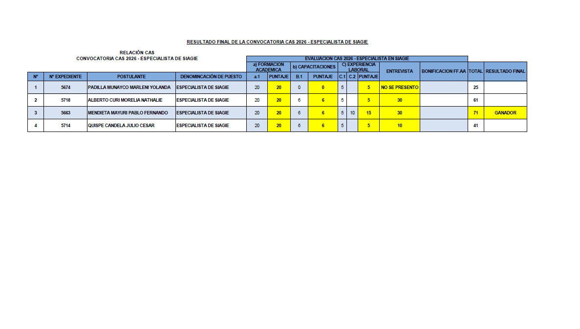📢 **RESULTADO FINAL – CONVOCATORIA CAS 2026****Especialista de SIAGIE**