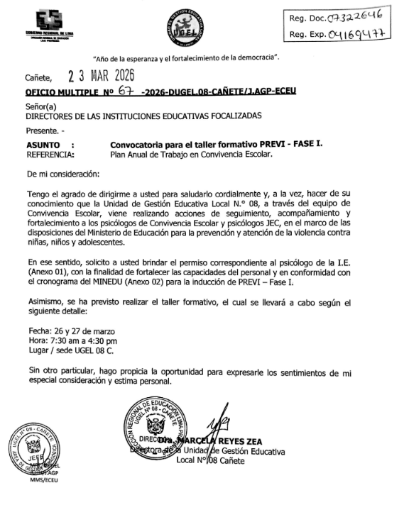 Lun, 23 de marzo, 2026 San Vicente Cañete.La UGEL N.° 08 Cañete, a través del equipo de Convivencia Escolar, invita al: 🎓 TALLER FORMATIVO PREVI – FASE I(Programa Integral de Prevención de la Violencia en el Entorno Escolar) 🔎 Objetivo:Fortalecer las capacidades de los psicólogos de las II.EE. para la prevención y atención de la violencia contra niñas, niños y adolescentes. 📅 […]