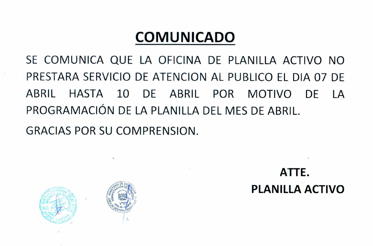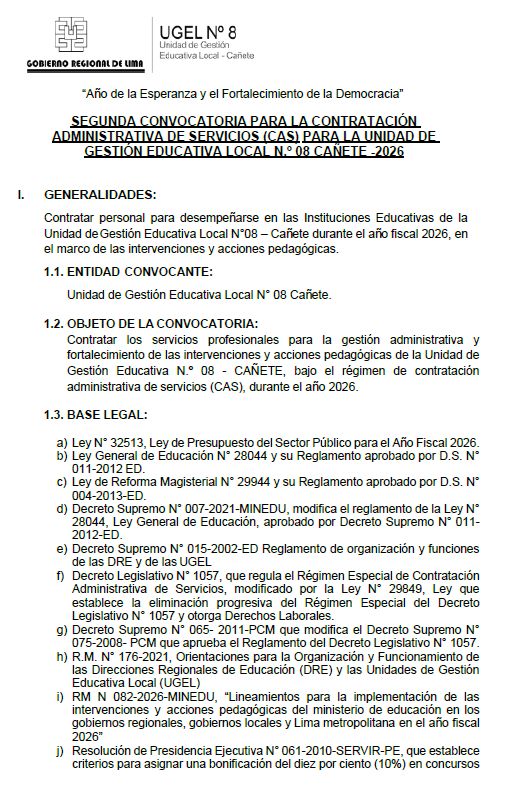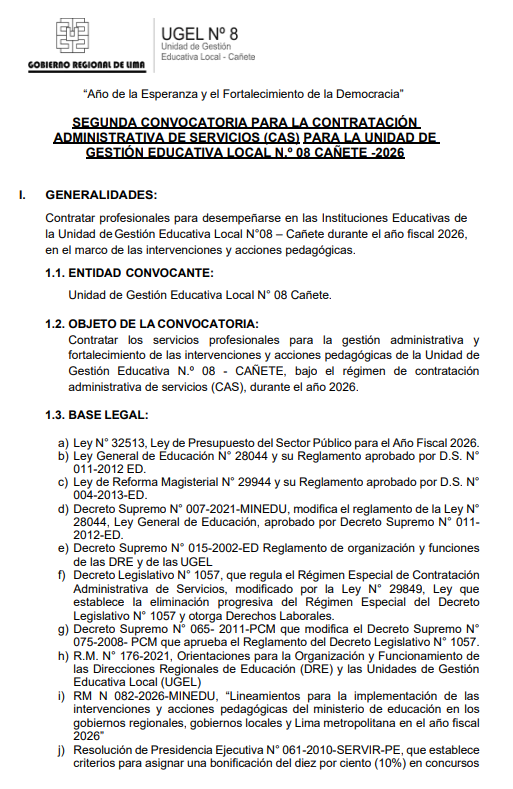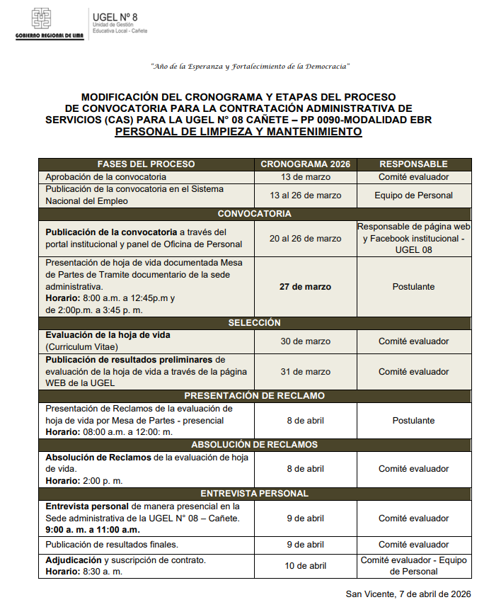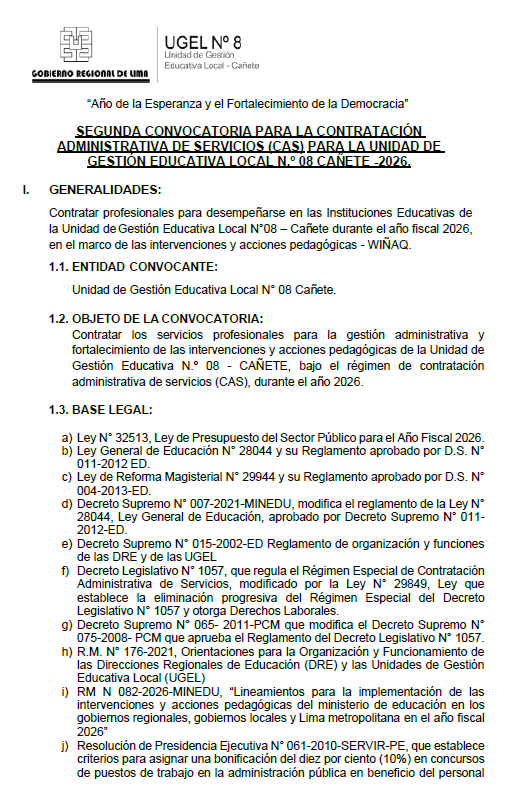Mar, 7 de abril, 2026 San Vicente Cañete.La Unidad de Gestión Educativa Local N° 08 – Cañete anuncia su Segunda Convocatoria CAS 2026 para fortalecer las intervenciones y acciones pedagógicas (Iniciativa WIÑAQ) en nuestras instituciones educativas. Estamos en la búsqueda de profesionales para el siguiente perfil: ⚽ Puesto: Técnico Deportivo CAS💰 Remuneración: S/ 3,465.00🗓️ Duración del contrato: 3 meses✅ Plazas disponibles: 1 […]