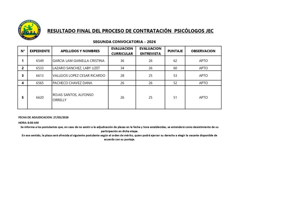 La UGEL N.° 08 Cañete, a través del área correspondiente, comunica a la ciudadanía en general y a los postulantes los RESULTADOS FINALES del proceso de la Segunda Convocatoria para la contratación de: