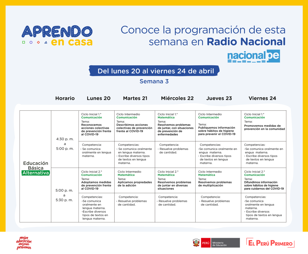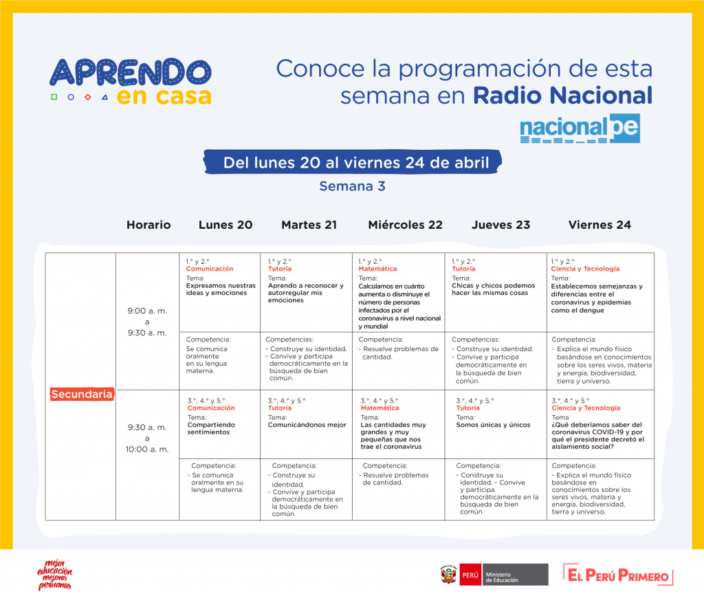 Dom, 19 de abril del 2020, 1:05 PM por UGEL08C UGEL08CAPRENDO EN CASA: PROGRAMACIÓN DEL LUNES 20 AL VIERNES 24 DE ABRIL EN RADIO NACIONAL