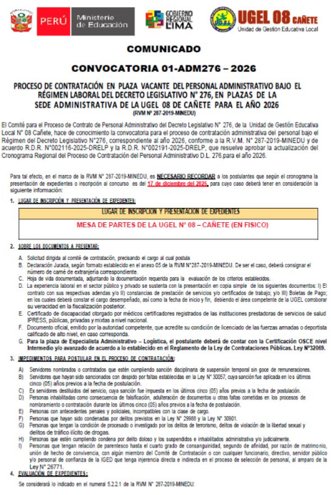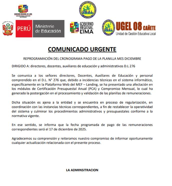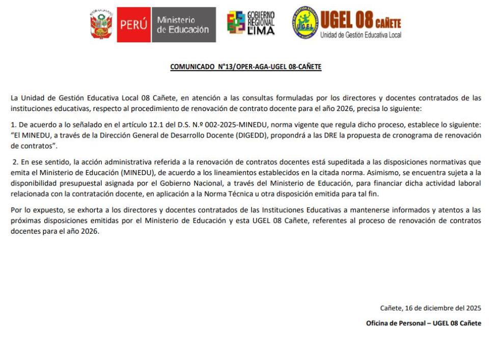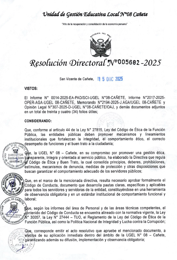 Mié, 17 de diciembre, 2025 San Vicente Cañete.Con el objetivo de garantizar una gestión transparente y orientada al servicio del ciudadano, la UGEL N°08 Cañete comunica la aprobación del nuevo CÓDIGO DE CONDUCTA.¿Qué establece esta resolución?Aprobación Oficial: Se formaliza el Código de Conducta en el marco de la Directiva del Código de Ética y Buen Trato.Compromiso Ético: Busca fortalecer la integridad, el […]