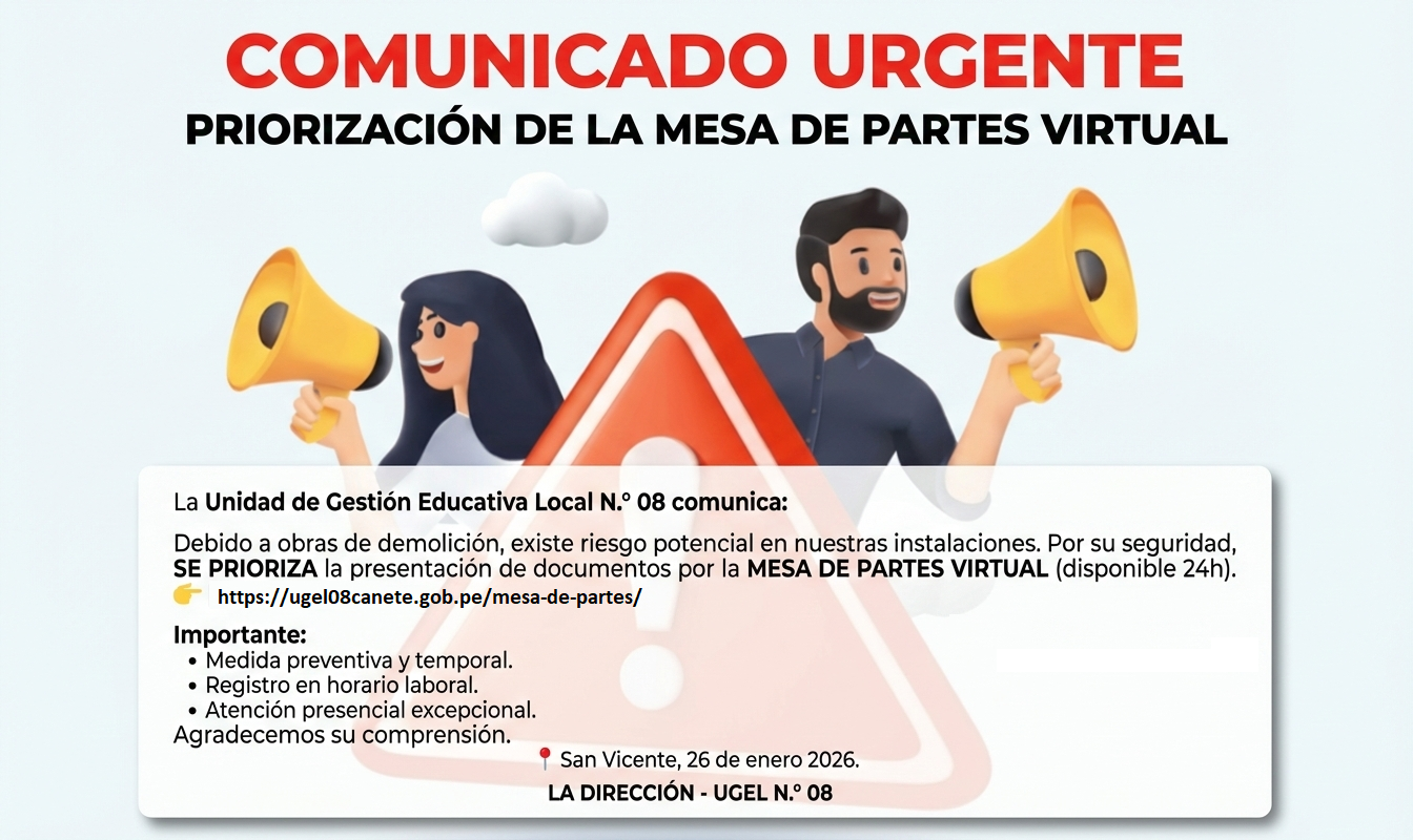 Leer mas...Priorización de la Mesa de Partes Virtual por razones de seguridad La Unidad de Gestión Educativa Local N.° 08 comunica a la comunidad educativa y público en general lo siguiente: Que, debido a los trabajos de demolición y/o obras que se vienen realizando en las instalaciones de esta entidad, se ha identificado un riesgo potencial […]