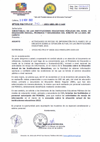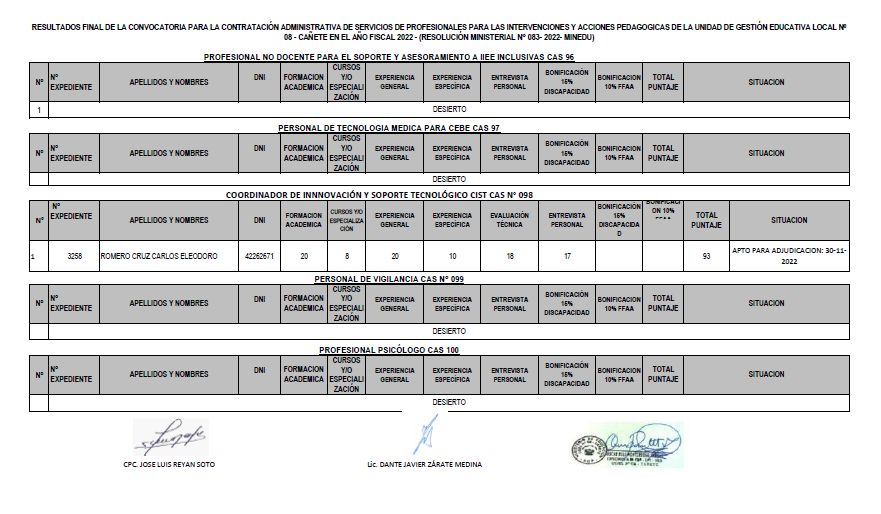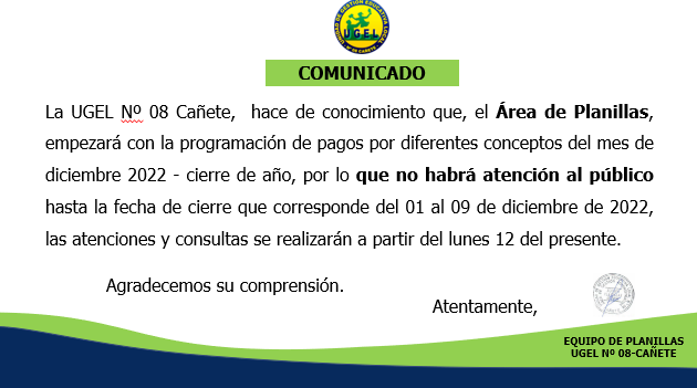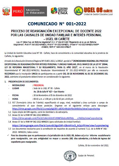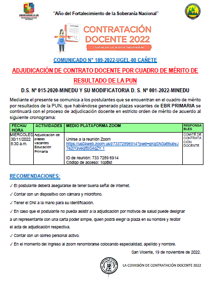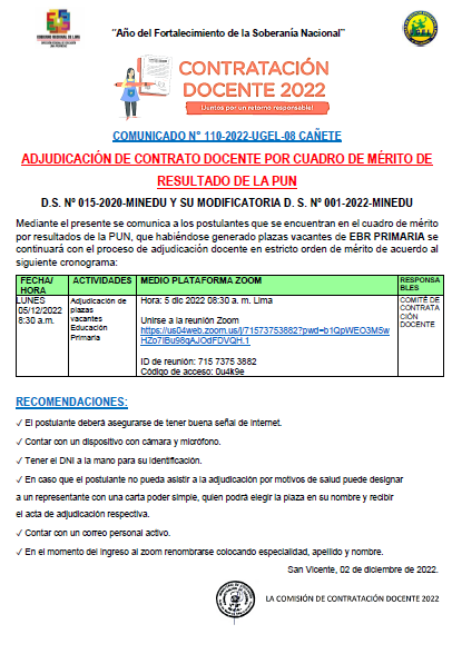 COMUNICADO N° 110-2022-UGEL-08 CAÑETE ADJUDICACIÓN DE CONTRATO DOCENTE POR CUADRO DE MÉRITO DE RESULTADO DE LA PUN