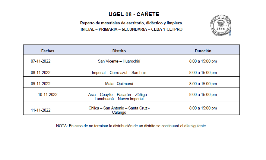 Sres. Directores de las II.EE., les enviamos la cronograma de reparto de materiales de escritorio, didáctico y limpieza.
