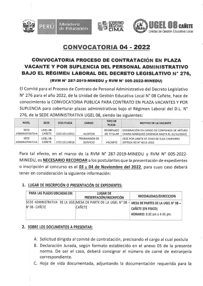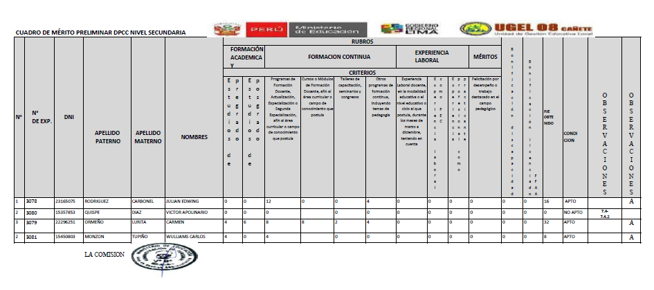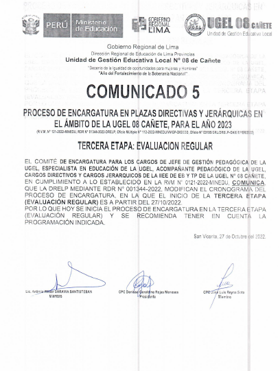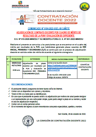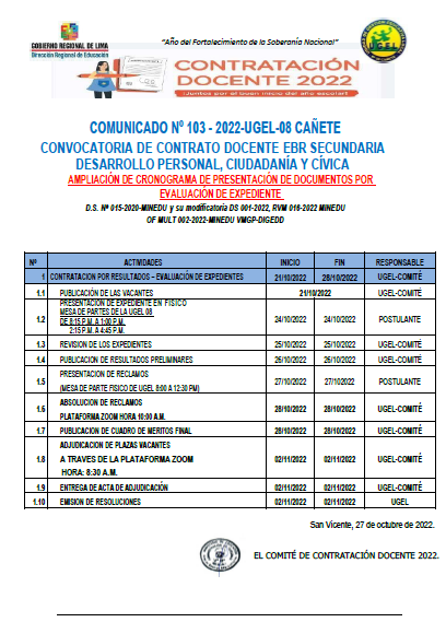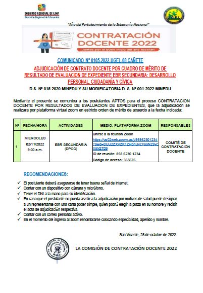 COMUNICADO N° 0105-2022-UGEL-08 CAÑETEADJUDICACIÓN DE CONTRATO DOCENTE POR CUADRO DE MÉRITO DE RESULTADO DE EVALUACION DE EXPEDIENTE EBR SECUNDARIA: DESARROLLO PERSONAL, CIUDADANÍA Y CÍVICA