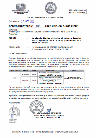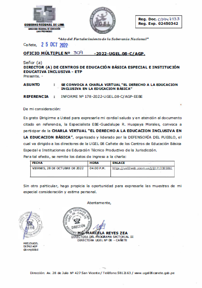 OFICIO MÚLTIPLE Nº 309-2022-UGEL.08-C/AGP.SE CONVOCA A CHARLA VIRTUAL «EL DERECHO A LA EDUCACIONINCLUSIVA EN LA EDUCACION BÁSICA»