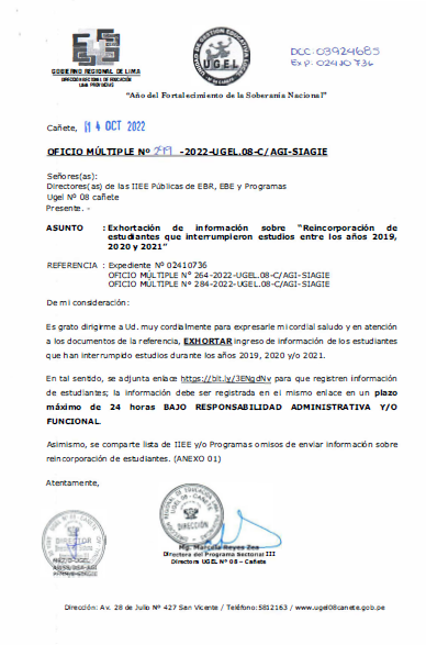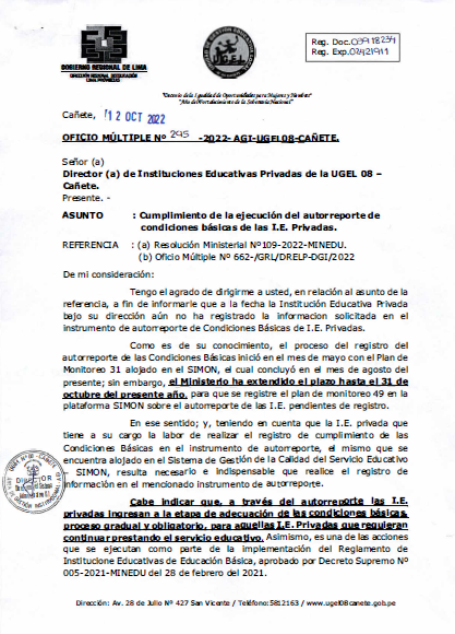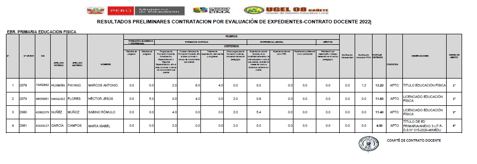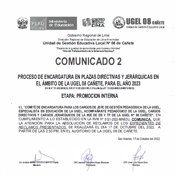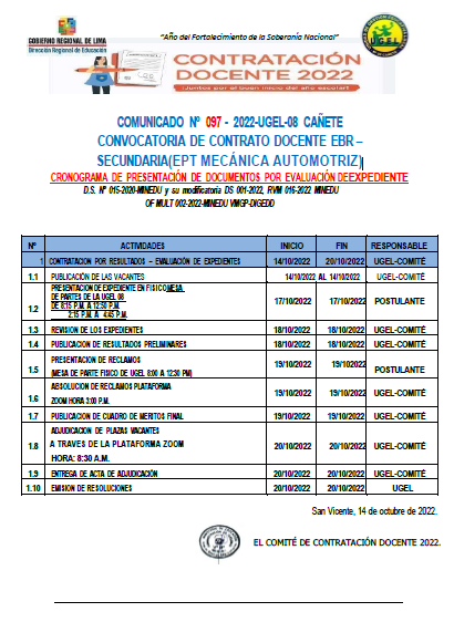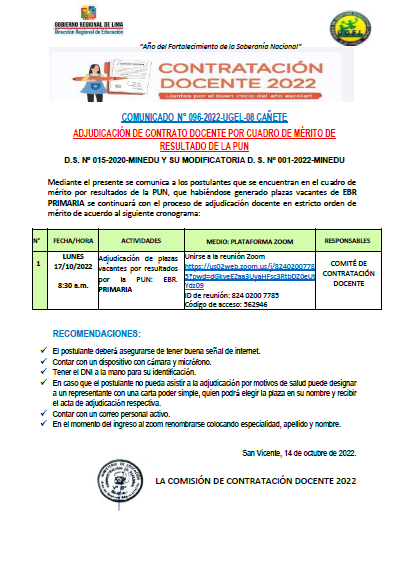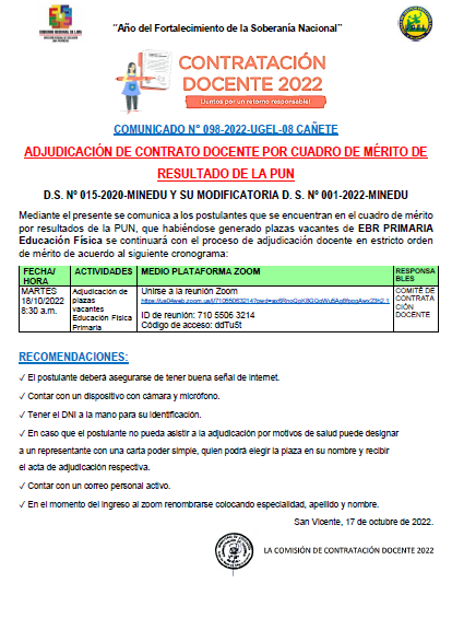 COMUNICADO N° 098-2022-UGEL-08 CAÑETE ADJUDICACIÓN DE CONTRATO DOCENTE POR CUADRO DE MÉRITO DE RESULTADO DE LA PUN