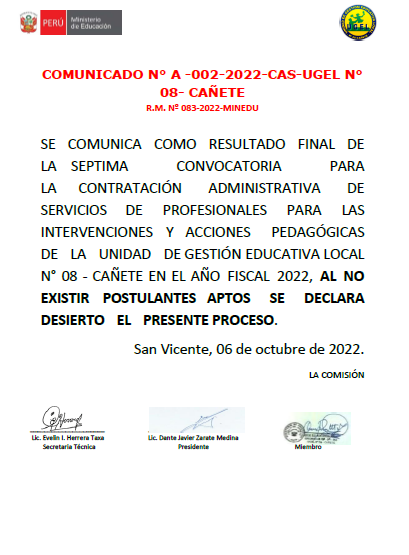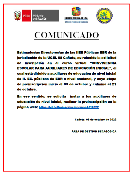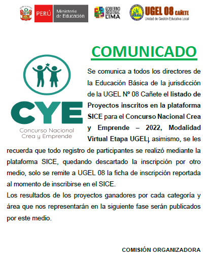 Leer mas...Se comunica a todos los directores de la Educación Básica de la jurisdicción de la UGEL Nº 08 Cañete el listado de Proyectos inscritos en la plataforma SICE para el Concurso Nacional Crea y Emprende – 2022, Modalidad Virtual Etapa UGEL. DESCARGAR LINK DE COMUNICADO https://drive.google.com/file/d/1i2FFlnnF5hCpBRNMlXqDxUQgoGS-ypr4/view?usp=sharing