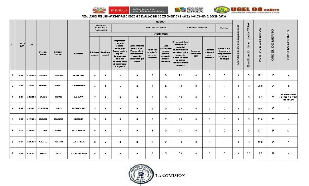 Cuadro preliminar resultados de evaluación de Expediente EBR secundaria – Ingles