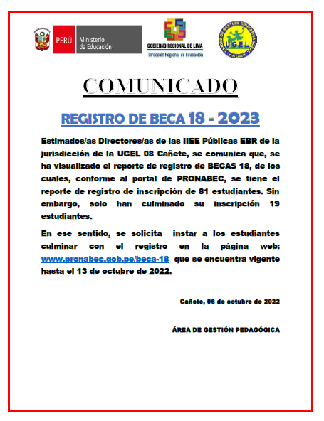 Leer mas...REGISTRO DE BECAS 18-2023 Atención directores de las II.EE. Públicas EBR de la jurisdicción de la UGEL Nº 08 Cañete DESCARGAR LINKhttps://drive.google.com/file/d/1FX4SdGNbj2PbsVFV8ixNeHwuMv5IlW4v/view?usp=sharing