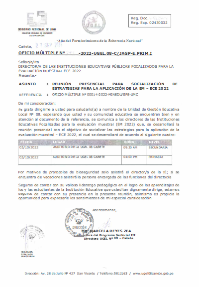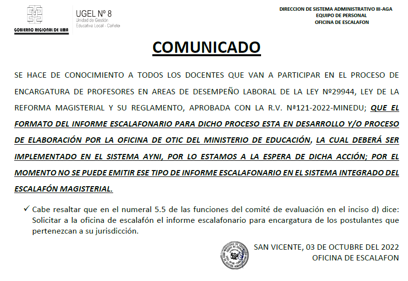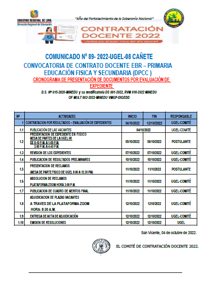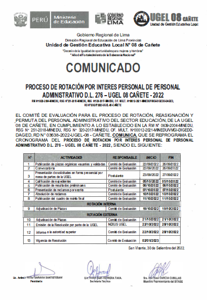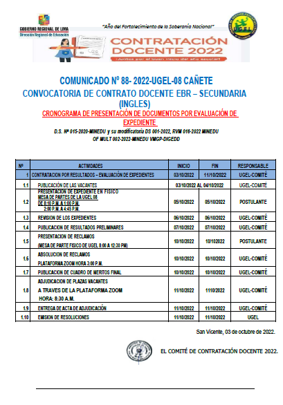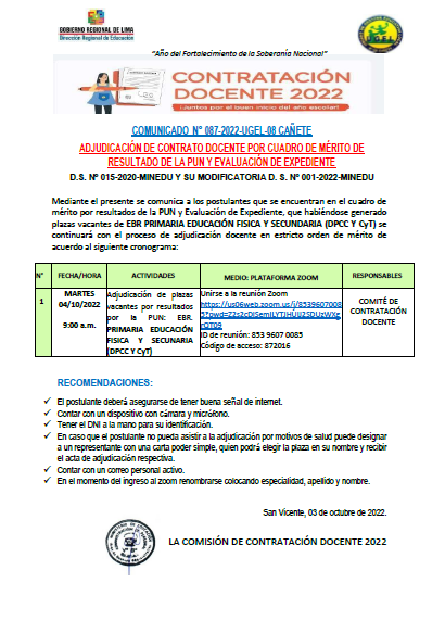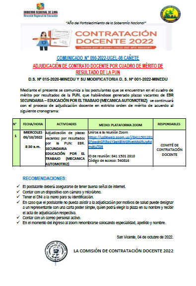 COMUNICADO N° 090-2022-UGEL-08 CAÑETEADJUDICACIÓN DE CONTRATO DOCENTE POR CUADRO DE MÉRITO DE RESULTADO DE LA PUN