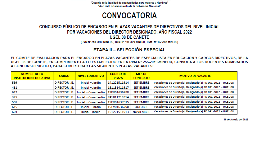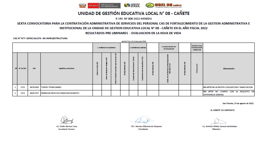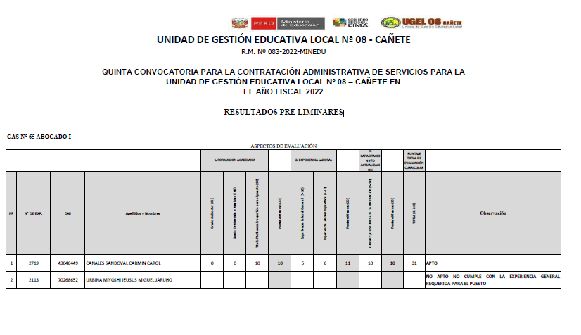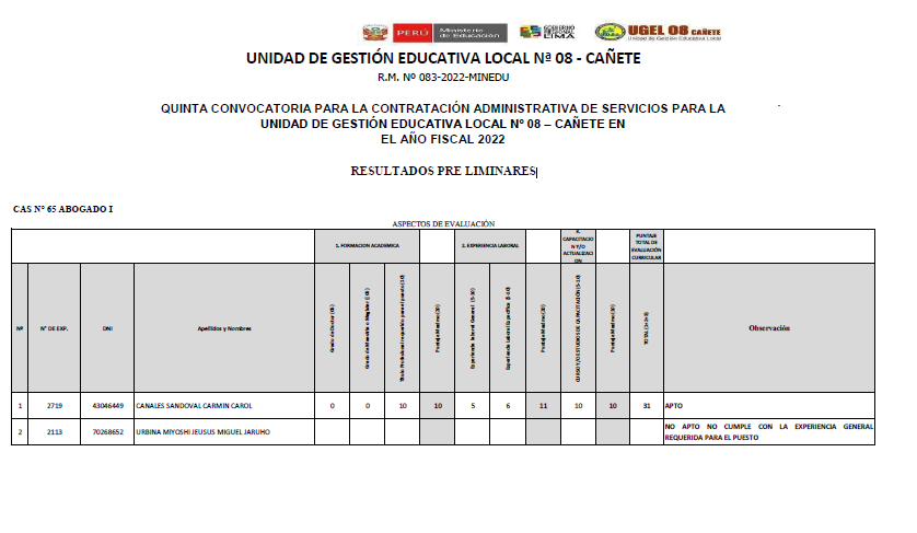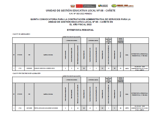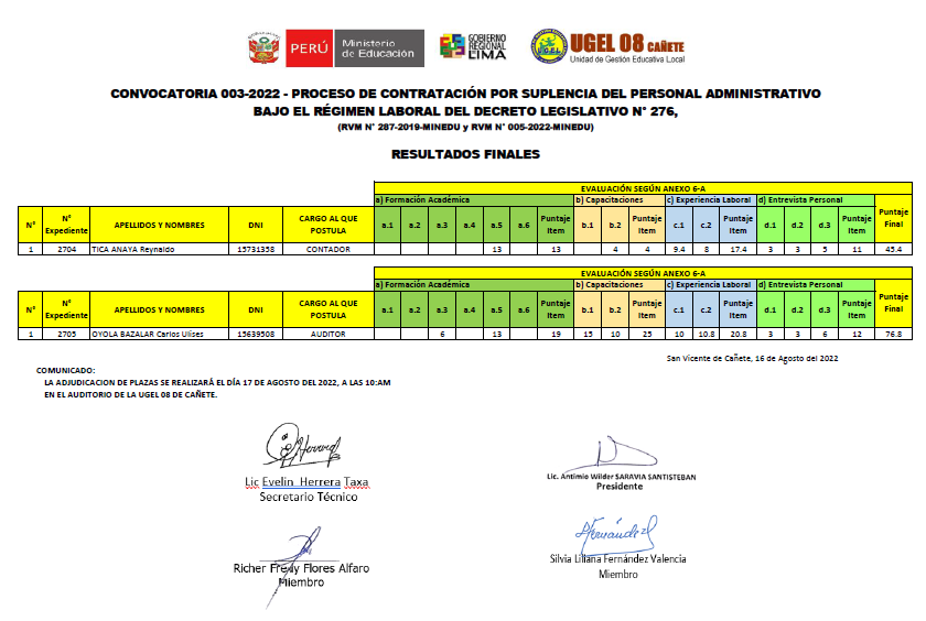 RESULTADOS FINALES CONVOCATORIA 003-2022 – PROCESO DE CONTRATACIÓN POR SUPLENCIA DEL PERSONAL ADMINISTRATIVO BAJO EL RÉGIMEN LABORAL DEL DECRETO LEGISLATIVO N° 276, (RVM N° 287-2019-MINEDU y RVM N° 005-2022-MINEDU)