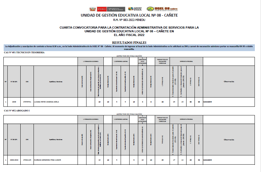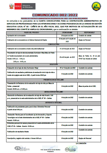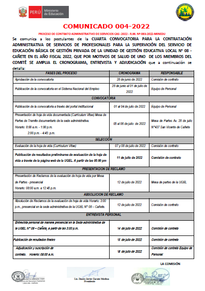 COMUNICADO 004-2022PROCESO DE CONTRATO ADMINISTRATIVO DE SERVICIOS CAS -2022 – R.M. Nº 083-2022-MINEDU