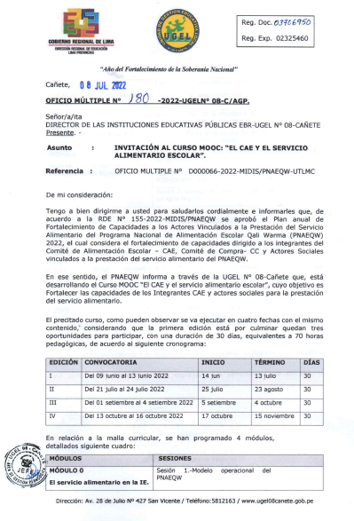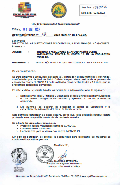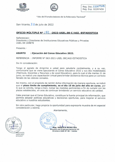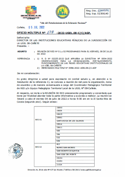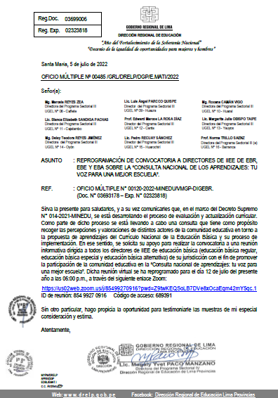 OFICIO MÚLTIPLE Nº 00485 /GRL/DRELP/DGP/E.MATI/2022REPROGRAMACIÓN DE CONVOCATORIA A DIRECTORES DE IIEE DE EBR, EBE Y EBA SOBRE LA “CONSULTA NACIONAL DE LOS APRENDIZAJES: TU VOZ PARA UNA MEJOR ESCUELA”.