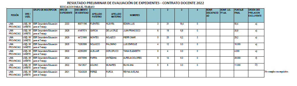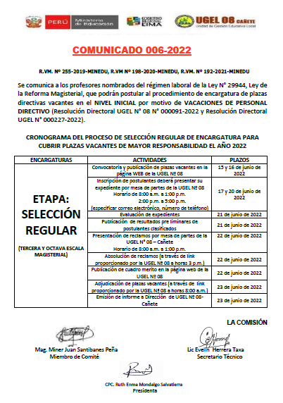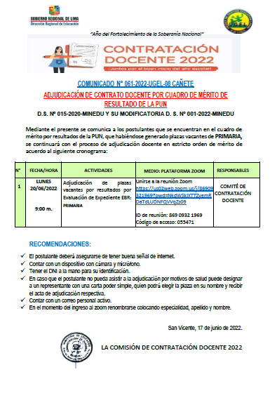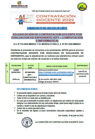 COMUNICADO N° 062 -2022-UGEL-08 CAÑETEADJUDICACIÓN DE CONTRATACION DOCENTE POREVALUACION DE EXPEDIENTE (EPT – COMPUTACIÓNE INFORMATICA)