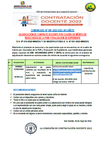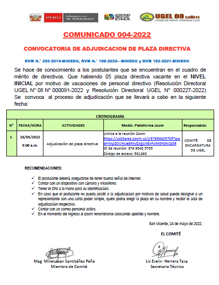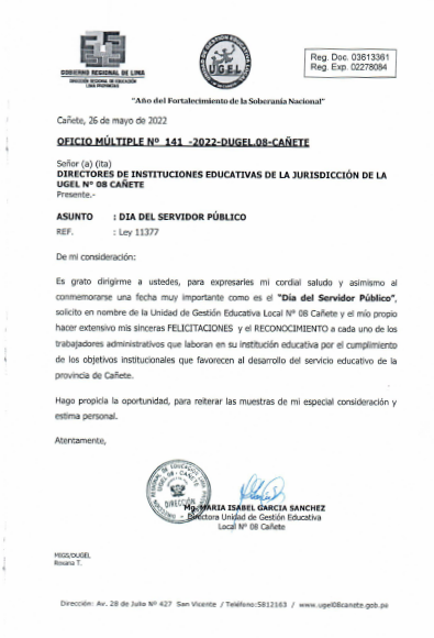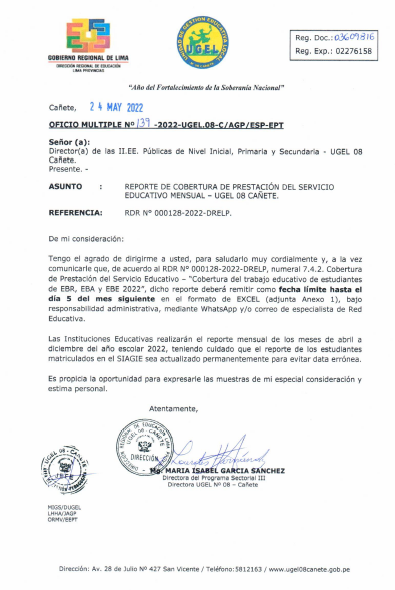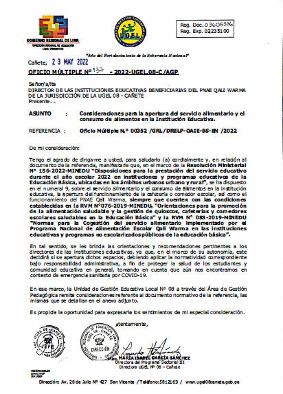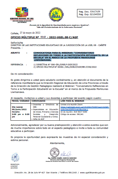 OFICIO MÚLTIPLE Nº 0143 – 2022-UGEL.08-C/AGPCONVOCATORIA PARA EL WEBINAR: “CONVERSATORIOREFLEXIONES EN TORNO A LA PARTICIPACIÓN ESTUDIANTIL EN LAESCUELA” EN EL MARCO DE LA PROPUESTA MARKKUNASLIWRISANAWA