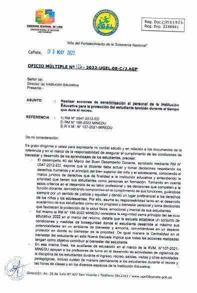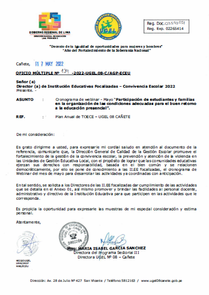 OFICIO MÚLTIPLE Nº 129-2022-UGEL.OS-C/AGP-ECEUCronograma de webinar – Mayo «Participación de estudiantes y familias en la organización de las condiciones adecuadas para el buen retorno a la educación presencial».