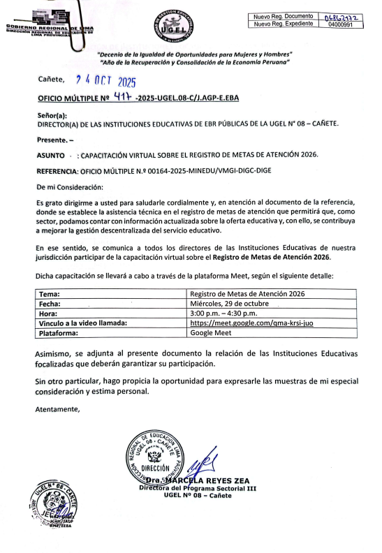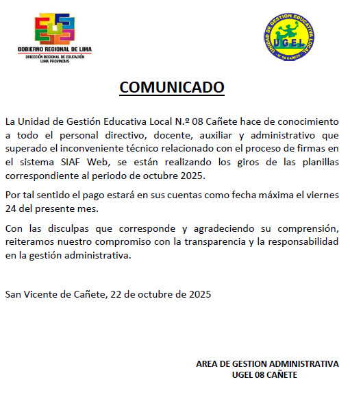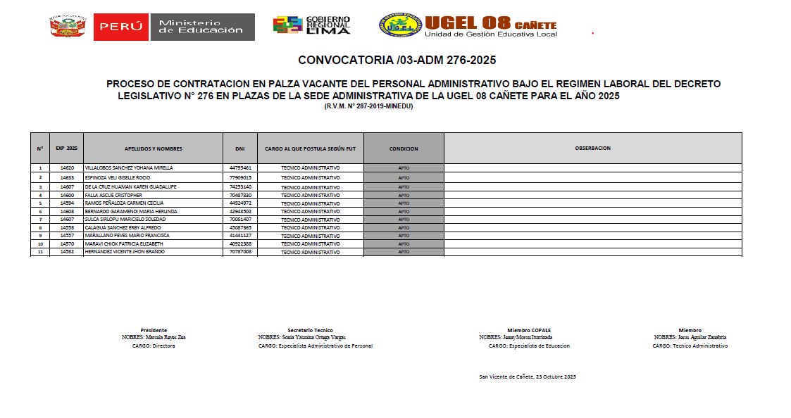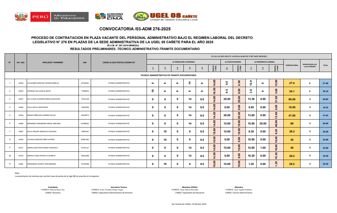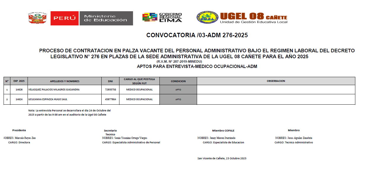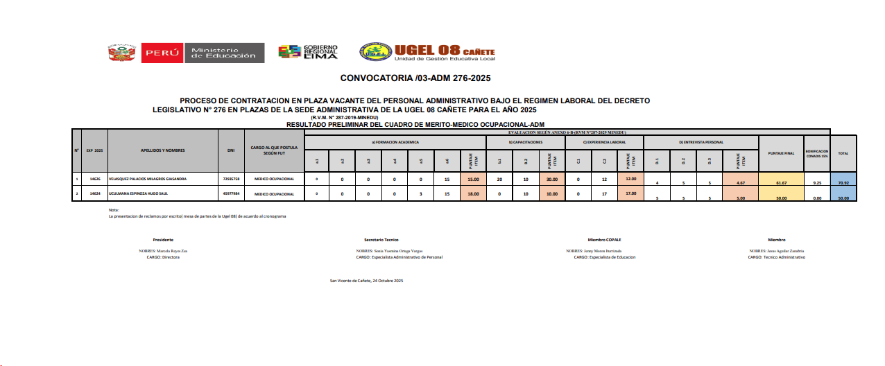 Vie, 24 de octubre, 2025 San Vicente Cañete.📢 COMUNICADO IMPORTANTELa UGEL 08 Cañete informa los resultados preliminares del Cuadro de Mérito del cargo Médico Ocupacional, correspondiente a la Convocatoria N.° 03-ADM-276-2025, dentro del proceso de contratación del personal administrativo bajo el régimen laboral del D.L. N.° 276 para el año 2025. 📄 Descarga el documento completo en el siguiente enlace:🔗 https://drive.google.com/file/d/1gd0PZxjn2rXNduJwiWcHae21APM3TmZQ/view?usp=sharing 🗓️ […]