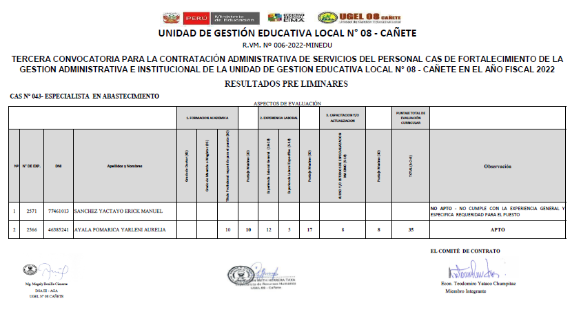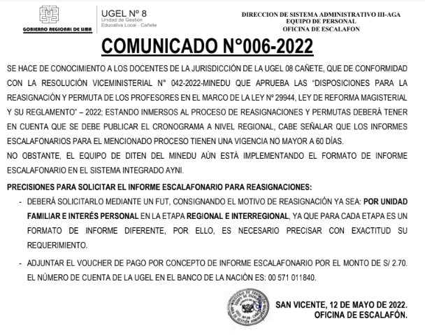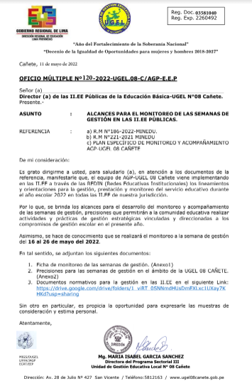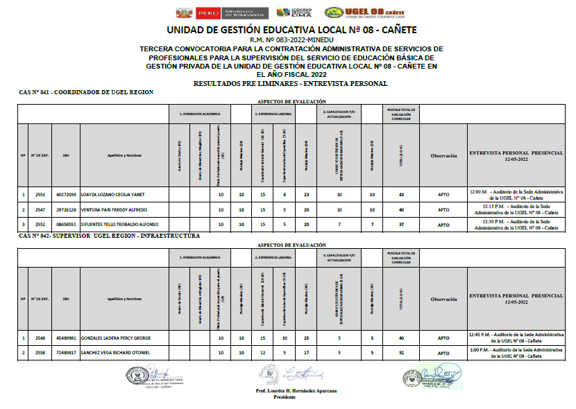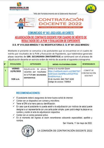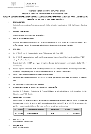 Jue, 12 de mayo, 2022 San Vicente Cañete.TERCERA CONVOCATORIAPARA LA CONTRATACIÓN ADMINISTRATIVA DE SERVICIOS PARA LA UNIDAD DE GESTIÓN EDUCATIVA LOCAL No 08 – CAÑETE DESCARGAR LINK: https://drive.google.com/file/d/1gju7hrLyg64GKDrooFuHO2xWQLOop5l4/view?usp=sharing