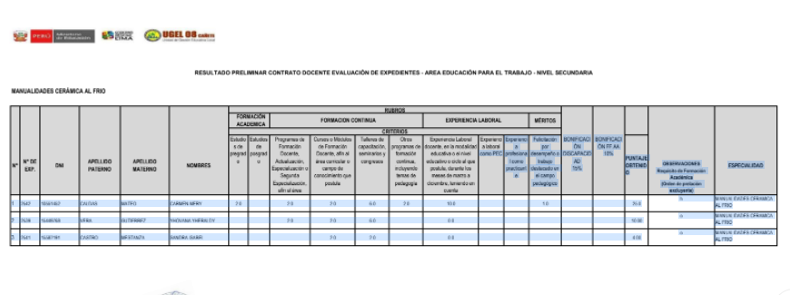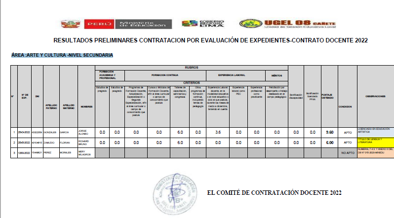 RESULTADOS PRELIMINARES CONTRATACION POR EVALUACIÓN DE EXPEDIENTES-CONTRATO DOCENTE 2022ÁREA: ARTE Y CULTURA -NIVEL SECUNDARIA