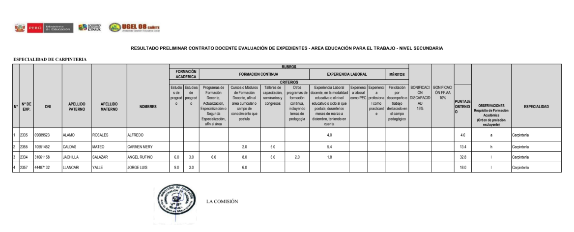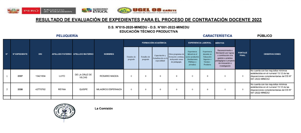 RESULTADO DE EVALUACIÓN DE EXPEDIENTES PARA EL PROCESO DE CONTRATACIÓN DOCENTE 2022