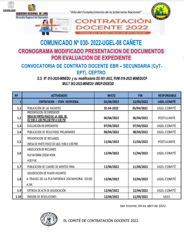 Lun, 4 de abril, 2022 San Vicente Cañete.CRONOGRAMA MODIFICADO PRESENTACION DE DOCUMENTOS POR EVALUACIÓN DE EXPEDIENTE DESCARGAR COMUNICADO : https://drive.google.com/file/d/1VKwly6And-fpxUav9616eOFmJ3ZL9FEL/view?usp=sharing DESCARGAR PLAZAS: https://drive.google.com/file/d/1VPoezEvTQ7JSn0KlHpj_iJDgd9s0euxq/view?usp=sharing