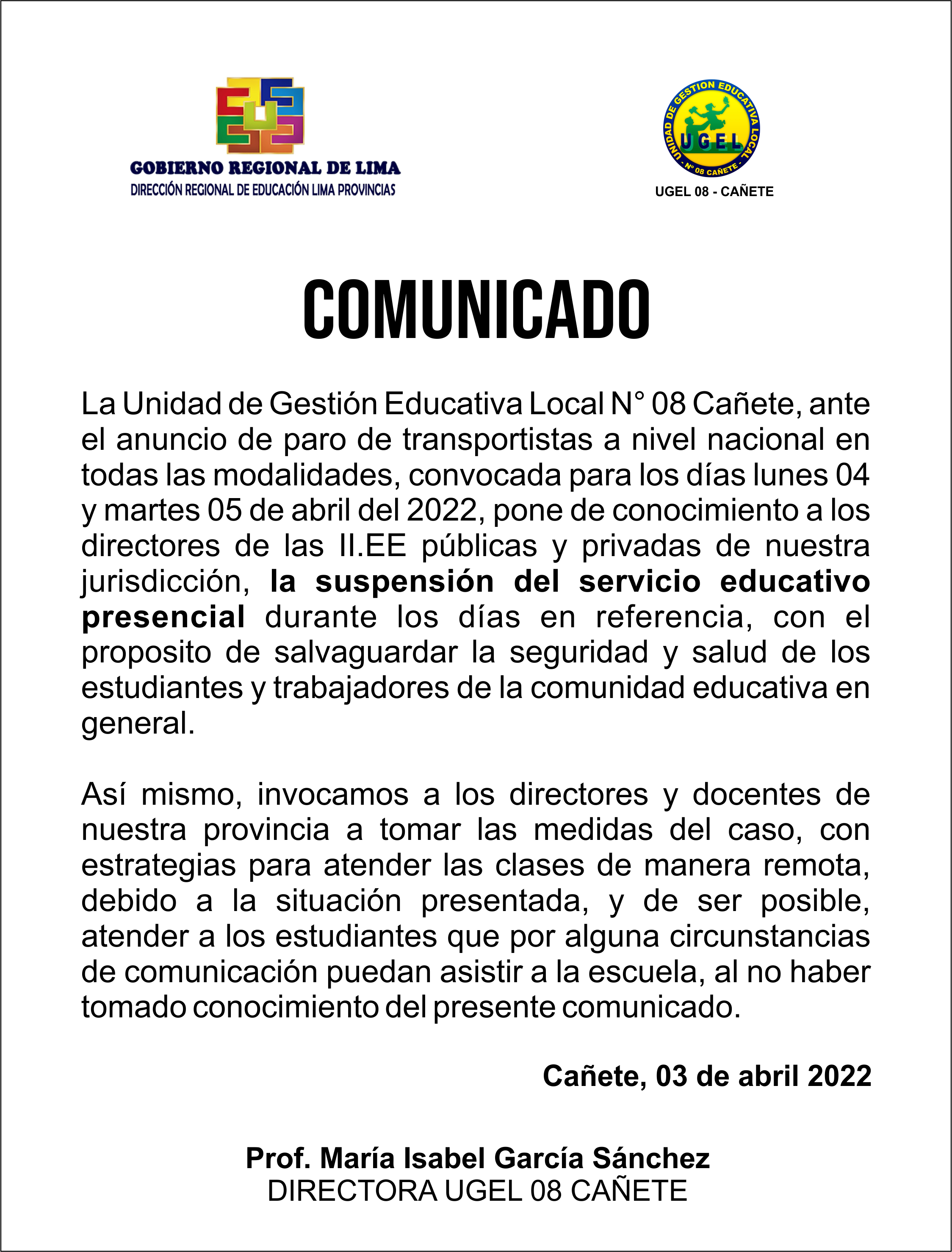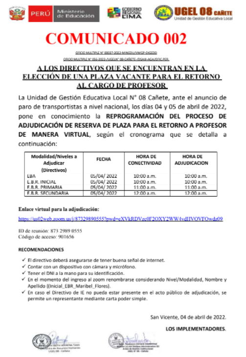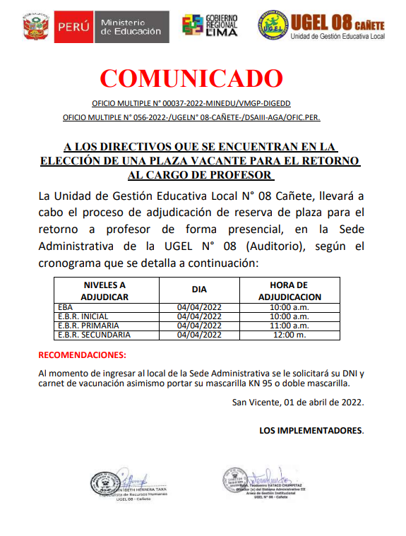 COMUNICADO No 030- 2022-UGEL-08 CAÑETE