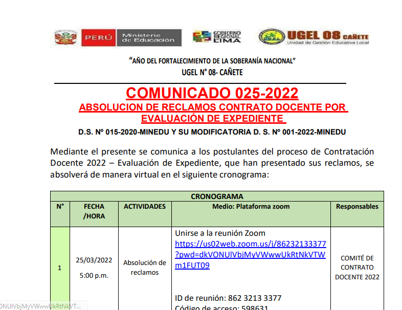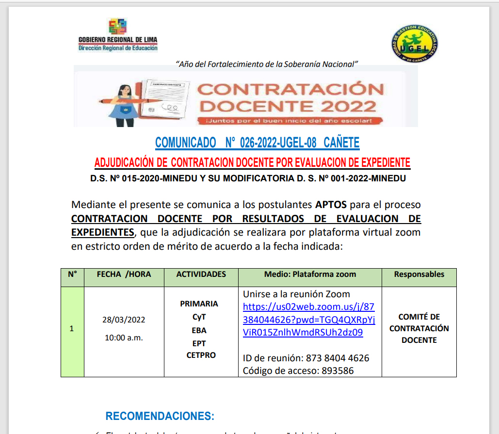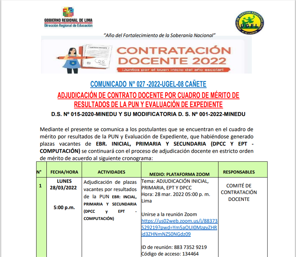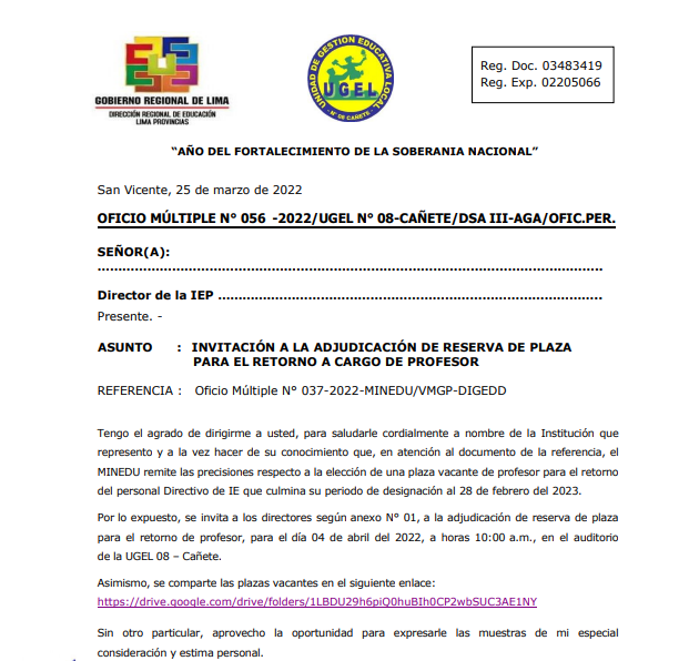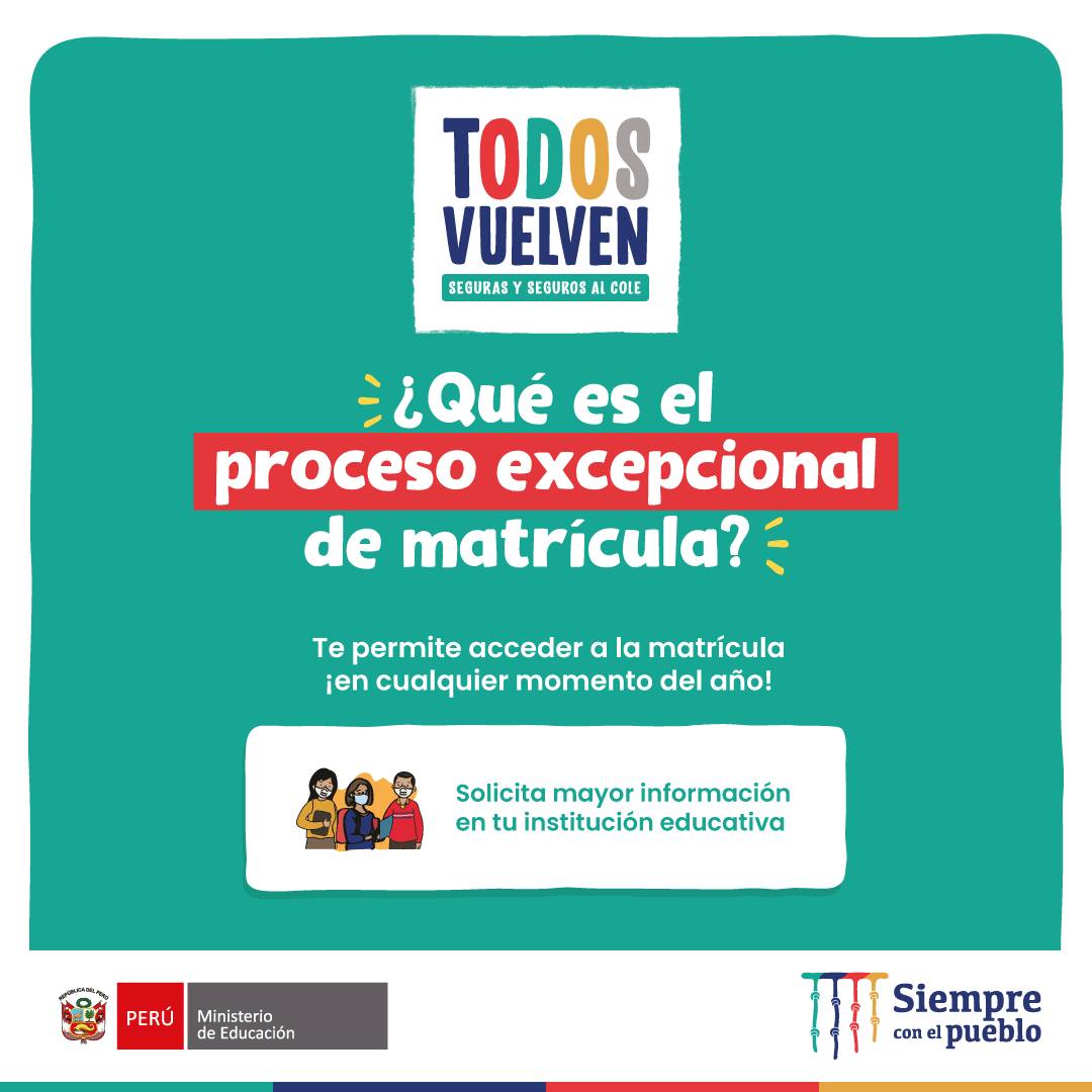 Vie, 25 de marzo, 2022 San Vicente Cañete.Si se te pasó la fecha del proceso regular de matrícula, ¡aún puedes conseguir una vacante para tu hijo(a)! Consulta por el proceso excepcional de matrícula en tu institución educativa.Recibe orientación de nuestros especialistas DRE y UGEL para este proceso aquí:Telef: 938207973Email: esp.cc.tt@ugel08canete.gob.pe