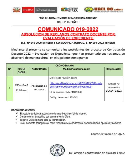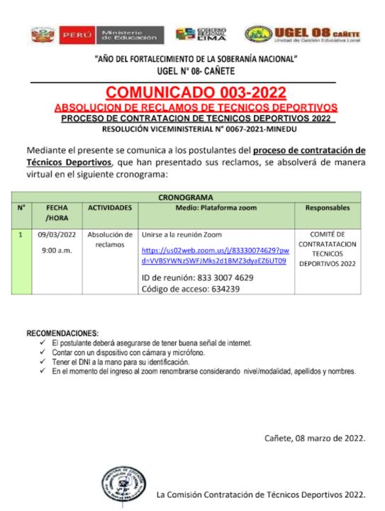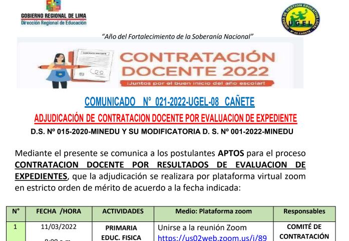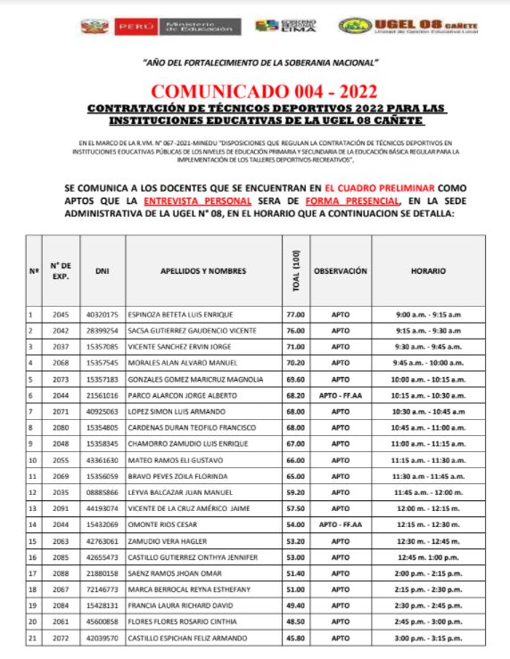 Leer mas...CONTRATACIÓN DE TÉCNICOS DEPORTIVOS 2022 PARA LAS II.EE DE LA UGEL 08 CAÑETESe comunica a los docentes que se encuentran en el cuadro preliminar como APTOS que la entrevista personal será de forma PRESENCIAL presencial, en la sede administrativa de la Ugel 08. DESCARGAR COMUNICADO : https://drive.google.com/file/d/1oM8yMJUkwwV49pS9a_tC5vlJId4u55g6/view?usp=sharing DESCARGAR CUADRO FINAL : https://drive.google.com/file/d/12bb3SCV7Kz1rjOAaLWC6Etj4ZfIe5Ock/view?usp=sharing