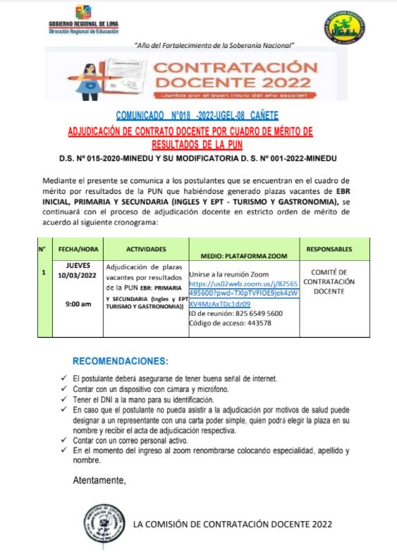Leer mas...DESCARGAR COMUNICADO: https://drive.google.com/file/d/173k-wn7rqeopewWlU1JbqPgj8UCpOH95/view?usp=sharing DESCARGAR PLAZAS : https://drive.google.com/file/d/14q236eHnlr85tBMG77RHUmmnZvj24Gr0/view?usp=sharing