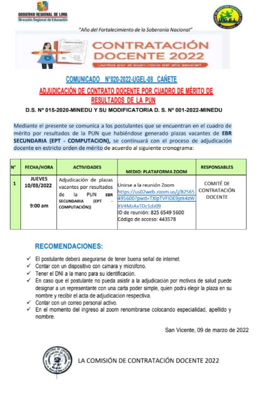 Leer mas...Mediante el presente se comunica a los postulantes que se encuentran en el cuadro de mérito por resultados de la PUN que habiéndose generado plazas vacantes de EBR SECUNDARIA (EPT – COMPUTACION), se continuará con el proceso de adjudicación docente en estricto orden de mérito. DESCARGAR COMUNICADO : https://drive.google.com/file/d/1mPqpZ3eNmiwOFWzz71vQ25k9xHkUZDw9/view?usp=sharing