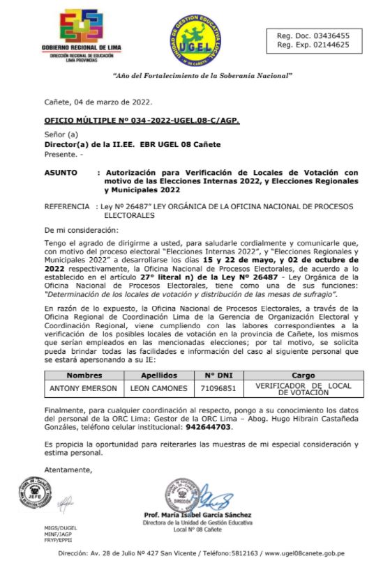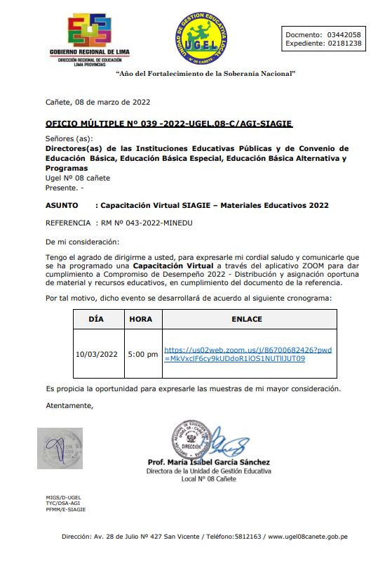 OFICIO MÚLTIPLE Nº 034 -2022-UGEL.08-C/AGP.
