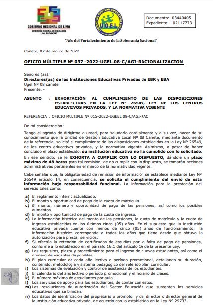 Leer mas...EXHORTACIÓN AL CUMPLIMIENTO DE LAS DISPOSICIONES ESTABLECIDAS EN LA LEY N° 26549, LEY DE LOS CENTROS EDUCATIVOS PRIVADOS, Y LA NORMATIVA VIGENTE DESCARGAR OFICIO : https://drive.google.com/file/d/1Bgc4jWE7uGpTXqggMVvsRNGPVpen_ScD/view?usp=sharing