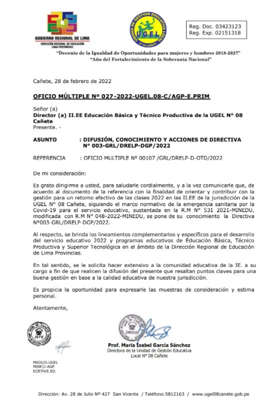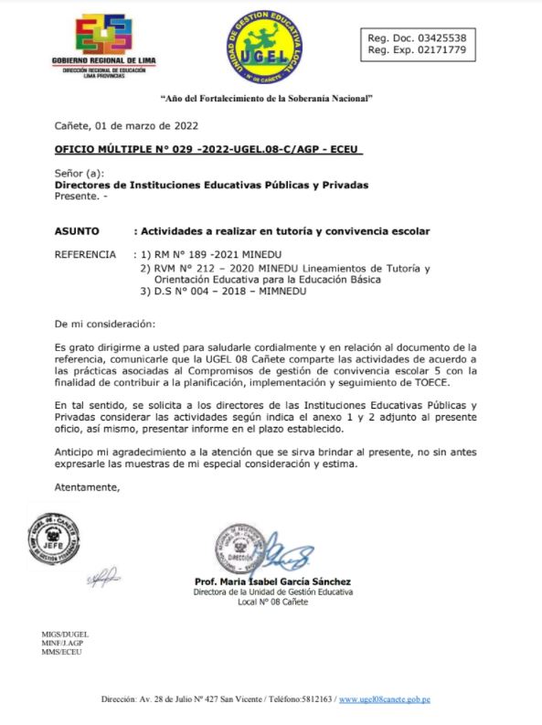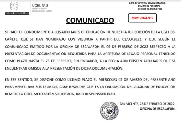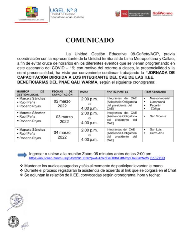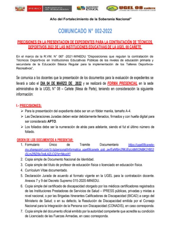 Mié, 2 de marzo, 2022 San Vicente Cañete.Precisiones en la presentación de expedientes para la contratación de Técnicos Deportivos 2022 de las Instituciones Educativas de la UGEL 08 Cañete DESCARGAR COMUNICADO : https://drive.google.com/file/d/18PmndMPLh2HZHsn3jAzBgfRgOdmZBxZL/view?usp=sharing