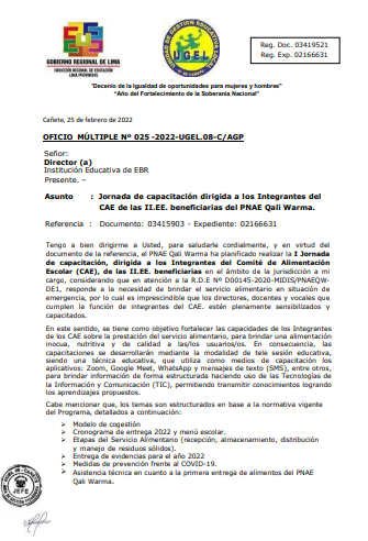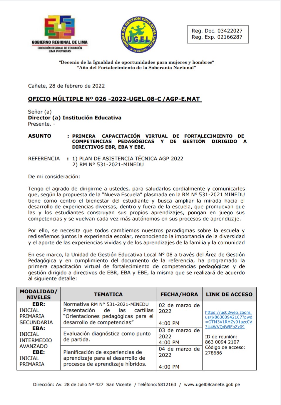 OFICIO MÚLTIPLE Nº 026 -2022-UGEL.08-C /AGP-E.MAT