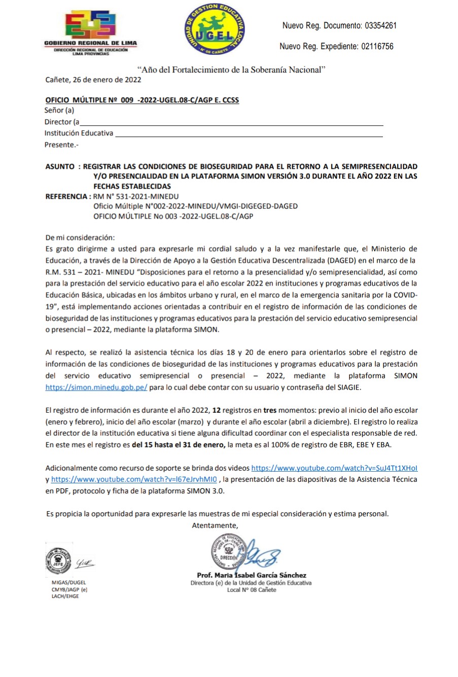 Leer mas...REGISTRAR LAS CONDICIONES DE BIOSEGURIDAD PARA EL RETORNO A LA SEMIPRESENCIALIDAD Y/O PRESENCIALIDAD EN LA PLATAFORMA SIMON VERSIÓN 3.0 DURANTE EL AÑO 2022 EN LAS FECHAS ESTABLECIDAS DESCARGAR OFICIO : https://drive.google.com/file/d/1UzKWyq9c8TwFW4DJ2r4b4O7a0Z2GMIhT/view?usp=drivesdk