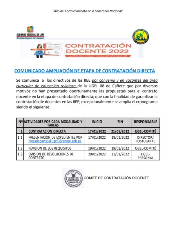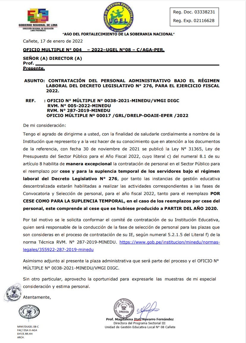 Leer mas...CONTRATACIÓN DEL PERSONAL ADMINISTRATIVO BAJO EL RÉGIMEN LABORAL DEL DECRETO LEGISLATIVO N° 276, PARA EL EJERCICIO FISCAL 2022. DESCARGAR OFICIO: https://drive.google.com/file/d/1ODgtRzg1GBqIrofI7-ZqVKDK-p9lrmkl/view?usp=drivesdk