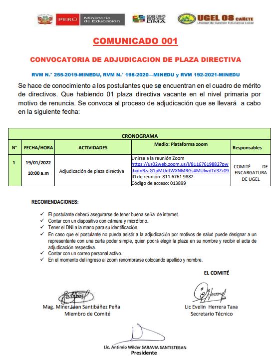 DESCARGAR COMUNICADO : https://drive.google.com/file/d/1OaNpMxiMSRn-wdNqoPFwiCyrJZG36yzR/view?usp=sharing DESCARGAR PLAZAS : https://drive.google.com/file/d/1O_tyKuducm1e5jFcrDqgAvJo-C3r4_0H/view?usp=sharing
