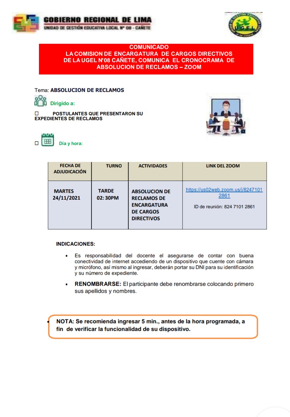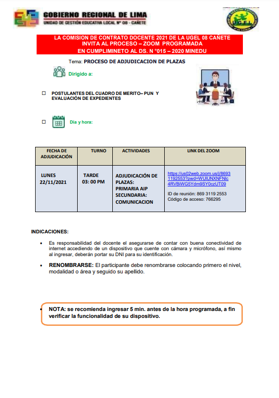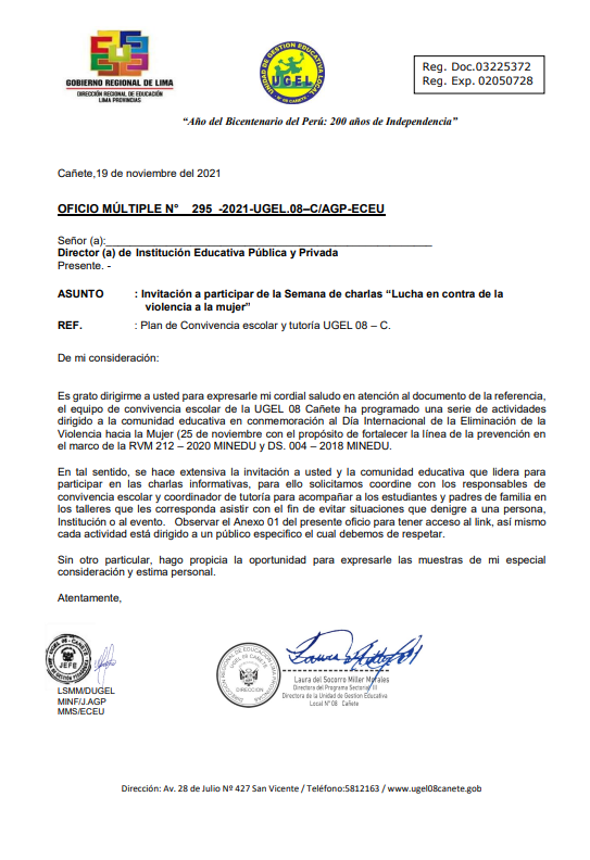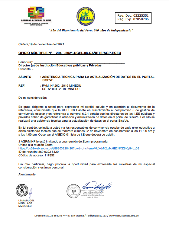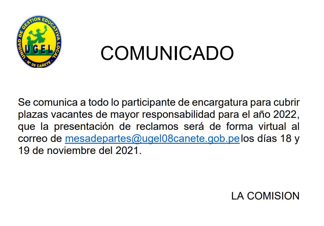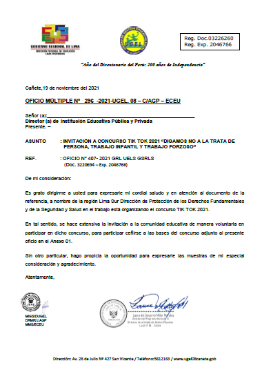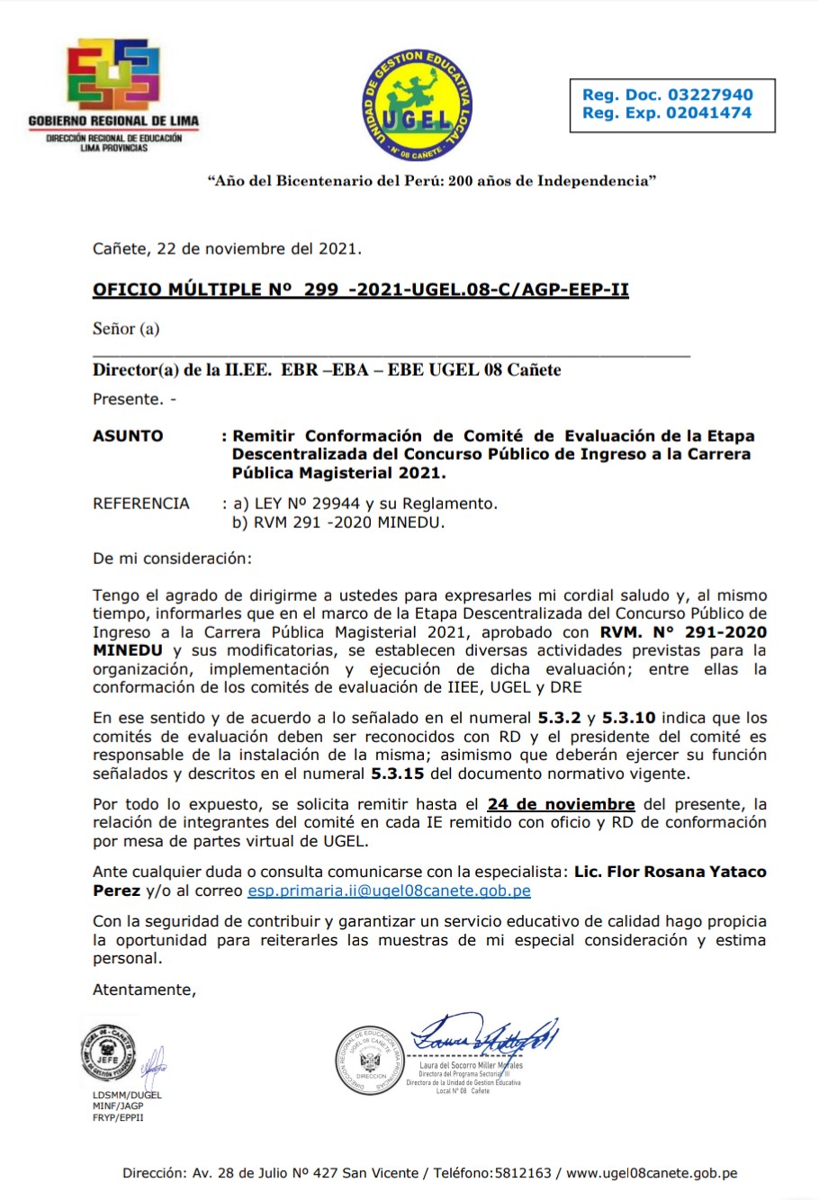 Lun, 22 de noviembre, 2021 San Vicente Cañete.Remitir Conformación de Comité de Evaluación de la Etapa Descentralizada del Concurso Público de Ingreso a la Carrera Pública Magisterial 2021 DESCARGAR OFICIO : https://drive.google.com/file/d/1hWc9lxx92kh2JGdvrdQWAnMLvxvyMweo/view?usp=drivesdk