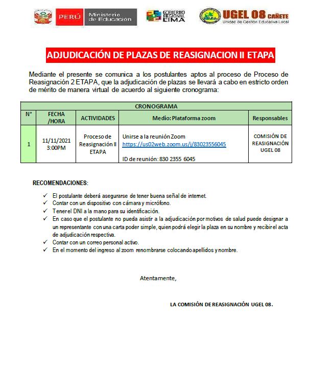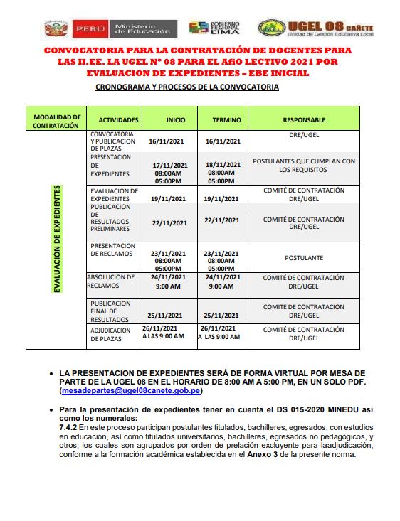 Mié, 17 de noviembre, 2021 San Vicente Cañete.Conformación y capacitación dirigidas de los Comités de Evaluación, sobre la Etapa Descentralizada del Concurso Público de Ingreso a la Carrera Pública Magisterial 2021 DESCARGAR OFICIO: https://drive.google.com/file/d/1JkaPnfmzuWdhBPyhT4f1B-DeJHnLXoBr/view?usp=sharing DESCARGAR PLAZAS VACANTES: https://drive.google.com/file/d/1exUMTHghjNpl5giZiHel7NyifpZZ8egl/view?usp=sharing
