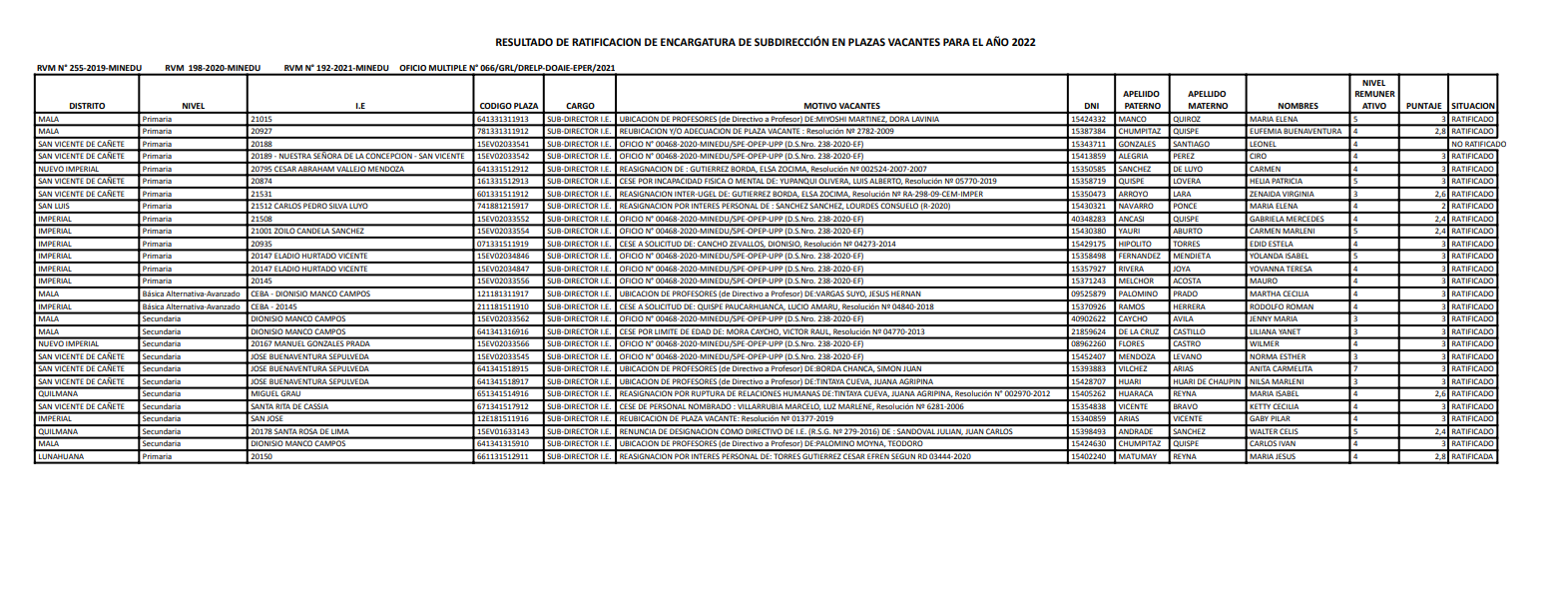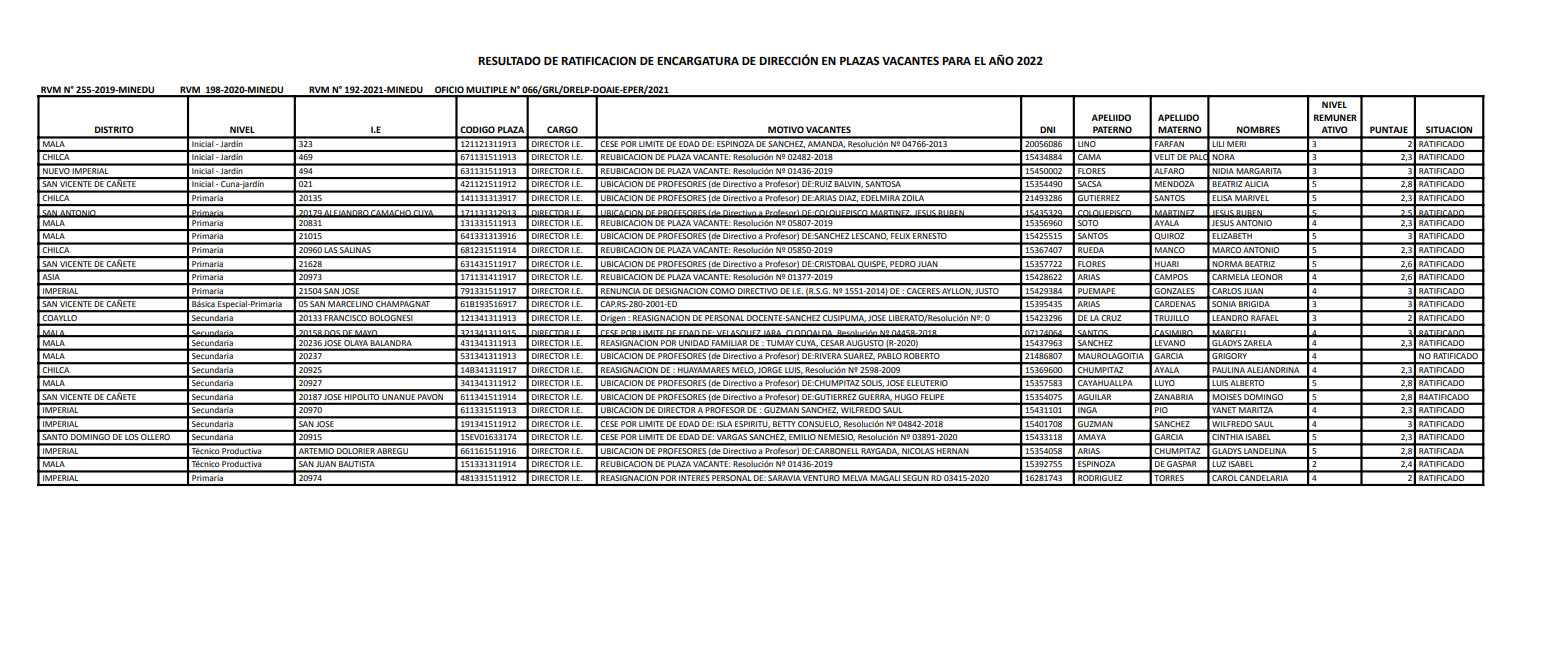 Resultado de ratificación de ENCARGATURA DE DIRECCIÓN en plazas vacantes para el año 2022.